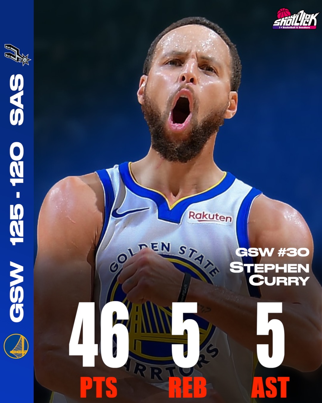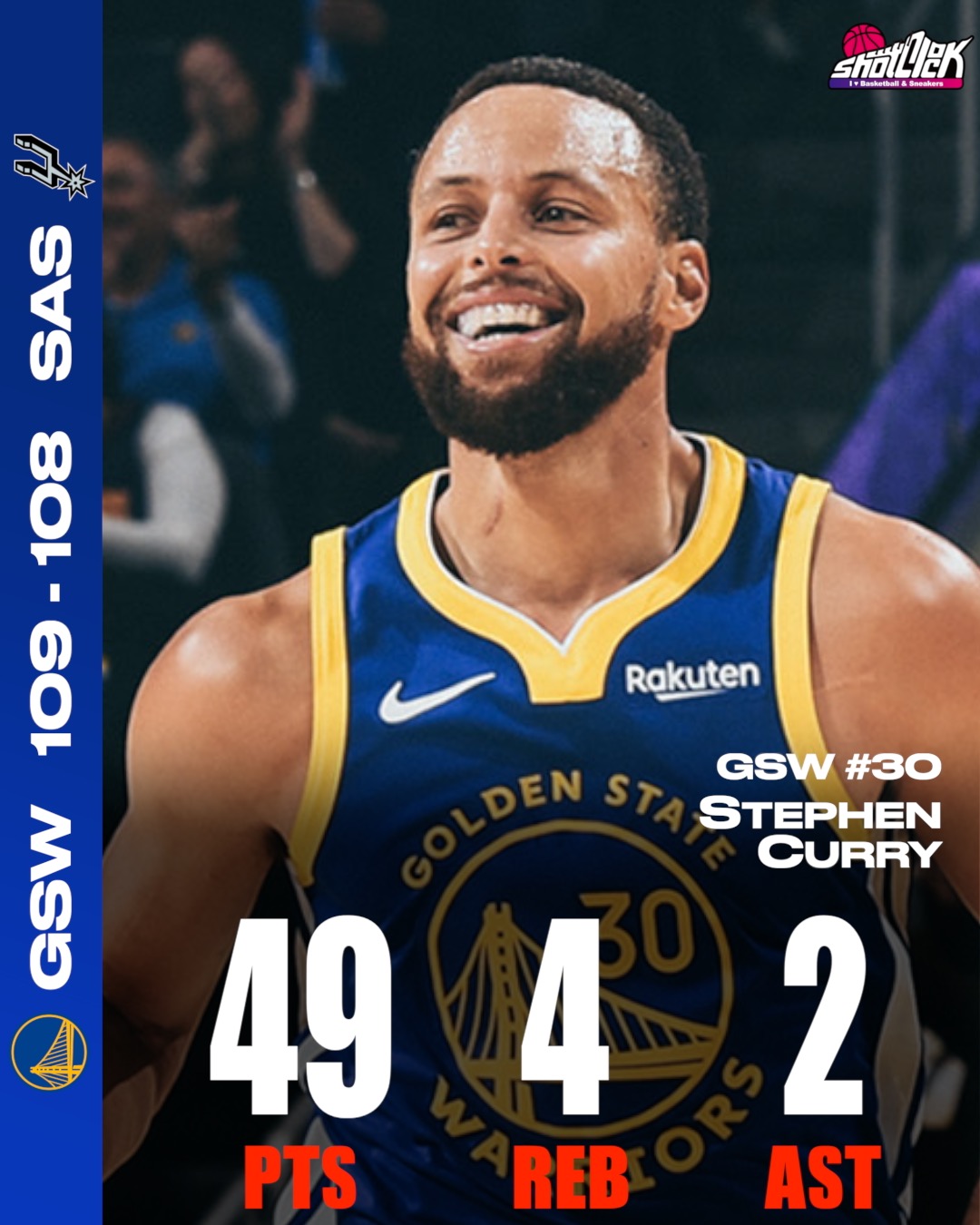 カリー、9本の3Pを決めて49得点!ウォリアーズがスパーズとの大接戦に勝利