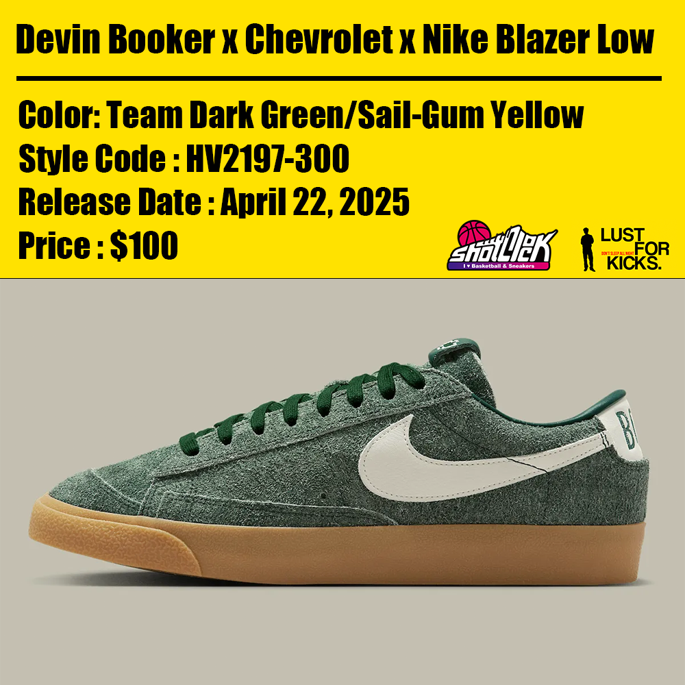 フェニックス・サンズに所属するデビン・ブッカーの愛車である1972年製シボレー・ブレザーへの情熱にインスパイアされてた一足が2025年4月22日に発売されます。深みのあるグリーンのヘアリースエードアッパーが、ヴィンテージカーのシートのような無骨な雰囲気を醸し出しており、レザーのスウッシュとヒールタブにはホワイトのアクセントがあしらわれ、ガムアウトソールがレトロ感を演出しています。タンとインソールにはシボレーのシグネチャーである蝶ネクタイロゴが施され、車とスニーカーの両方のファンに嬉しい両ブランドのこだわりが感じられます。また、キーホルダー型のハングタグ、レトロな広告風のペーパー、Nike x Chevroletのカスタムパッケージなど気分を盛り上げるディテールが詰め込まれています。