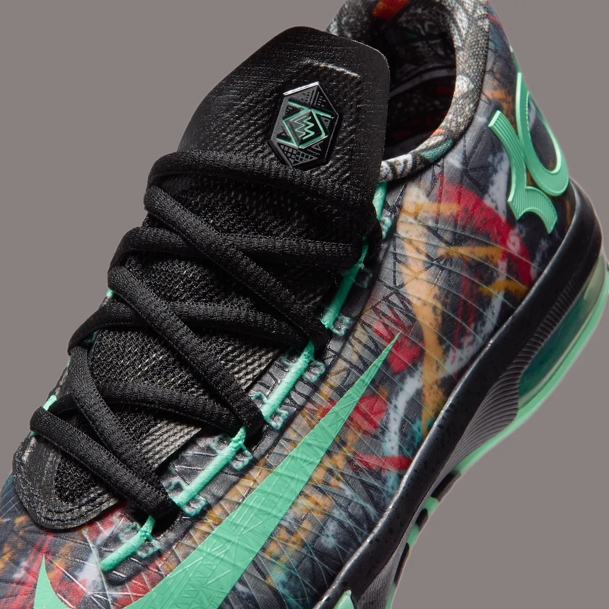 2014年ニューオーリンズで開催されたNBAオールスターゲームでケビン・デュラントが着用したNike KD 6 All-Star “Illusion”が12年の時を経て2026年2月27日に復刻発売されます。“NOLA Gumbo League”パックのひとつとして発売された本作は、対戦相手にとってデュラントのプレーが読みづらいことにインスピレーションを得た抽象的なグラフィックのアッパーに、ミントグリーンの蓄光アウトソール、メタリックなタッチ、プレミアムなオーバーレイ、ヒールのKDロゴなどのアクセントが施されています。